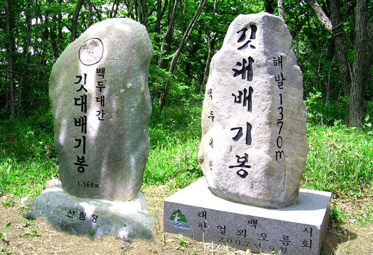 깃대배기봉은 산죽으로 덮여 있는 넓은 구릉지대로 되어있으며 돌로 된 정상 표지석이 세워져 있다. (태백산에서 약 4km/약 1시간 30분) 깃대배기봉을 지나면 팔뚝 크기의 철쭉나무가 들어차 있는 주 능선을 지나면 안부가 나온다. 여기서부터는 대체로 길이 수월하다. 참나무 군락과 산죽 군락을 지나 왼쪽 오른쪽 사면을 6번 정도 반복하면 사거리에 닿는다. (깃대배기봉에서 신선봉으로 가는 갈림길임)