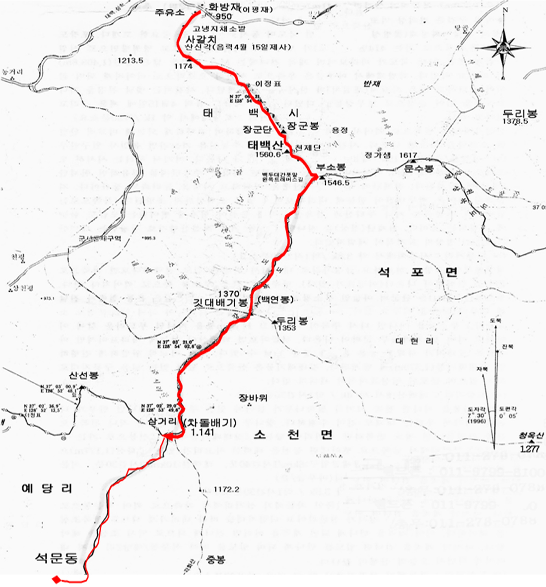 화방재(950m)-태백산(1,567m)-부소봉(1.,576m)-깃대봉(1,370m)-차돌배기 삼거리(1,141m)-석문동