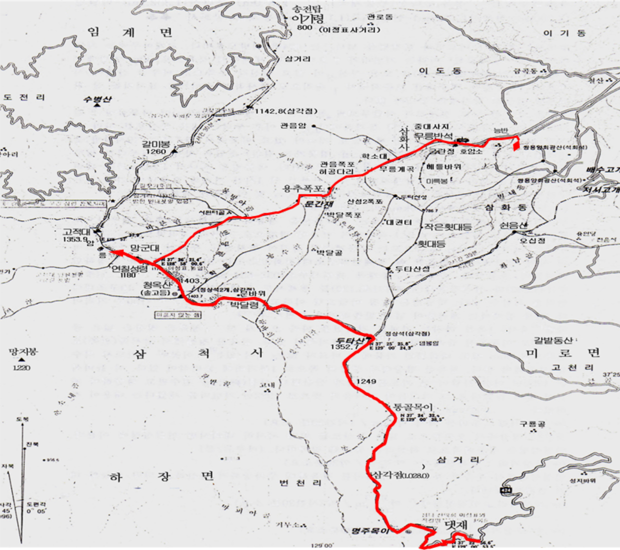 댓재(810m)-두타산(1.352.7m)-박달령(1.100m)-청옥산(1.403m)-연칠성령(1.180m)-무릉계곡-삼화사