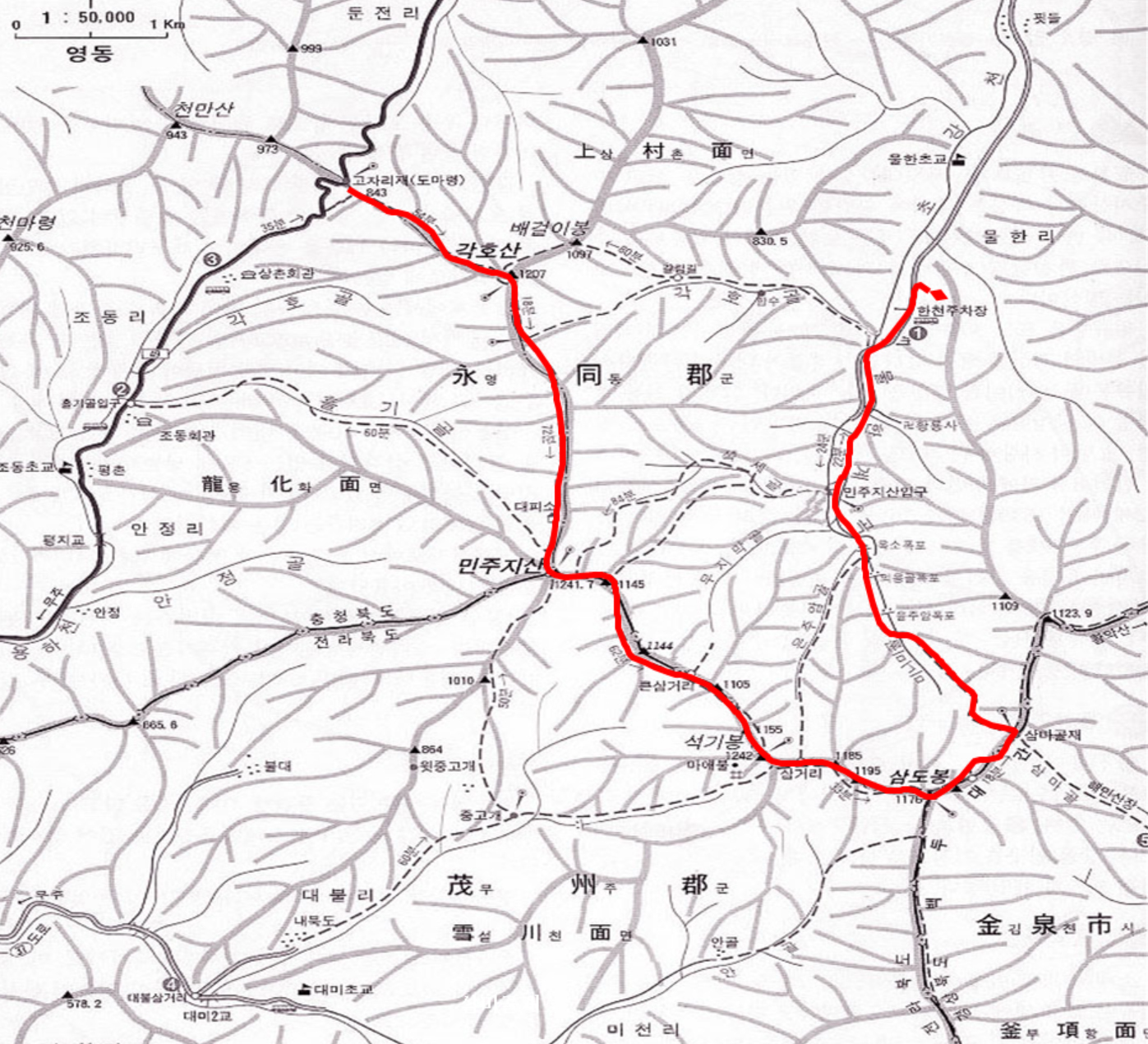 843도마령-1202각호산-1241민주지산-1242석기봉-1177삼도봉-삼마골재-삼거리-물한리계곡-황룡사-한천