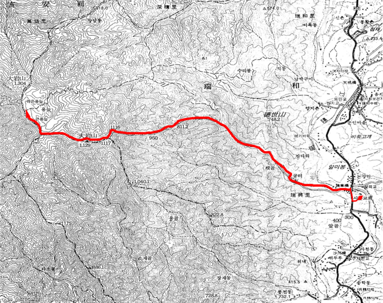 300논장교-용늪길-340공터-뒷골길-고도400.450사이-왼쪽능선으로-811.2m봉.능사면-950봉-990봉-1,160봉-1,170봉-1,304대암산-용늪탐방-Back-원점