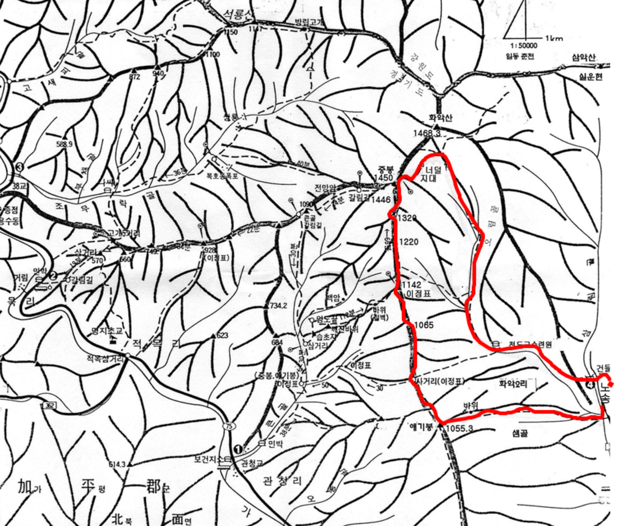 300노송쉼터-샘골-1.055.3애기봉-북릉-사거리-900안부-1.065봉-1.142봉-1.220봉-1.320봉-1.446능선분기점-1.450중봉(우)-너덜지대-군사도로(아리랑고개)-1.310전신주(남)-840합수점-오림계곡-680승원폭포-640합수점-590천도교 수련원-임도-건들네-300 노송 쉼터