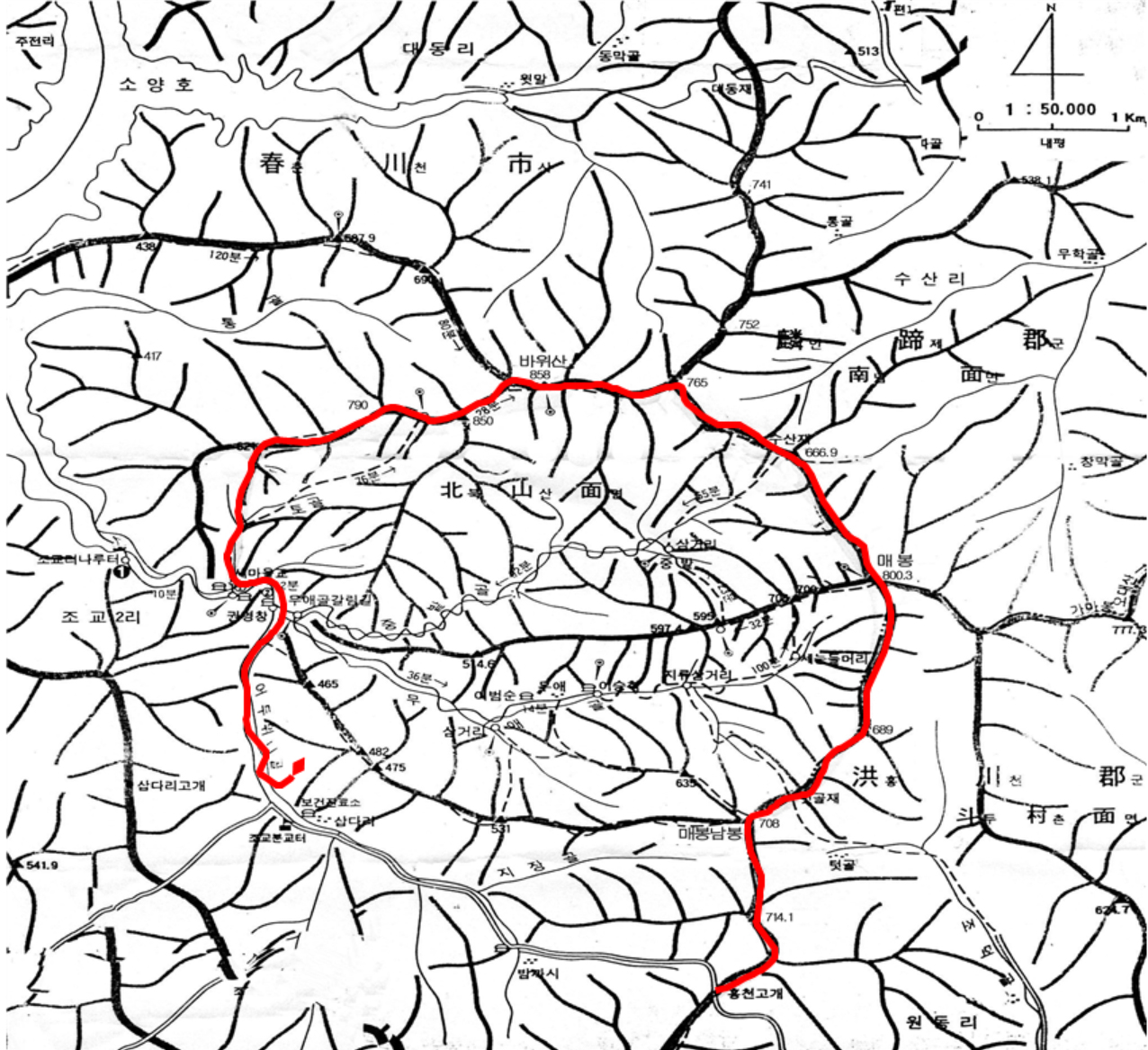 500홍천고개-714.1봉-650안부-708매봉남봉-650텃골재-705봉-689봉-800.3매봉-666.9봉-수산재-630안부.임도-765봉-859바위봉(돌탑)-790안부-850봉-790봉-710봉-621봉-250토골-200새마을교