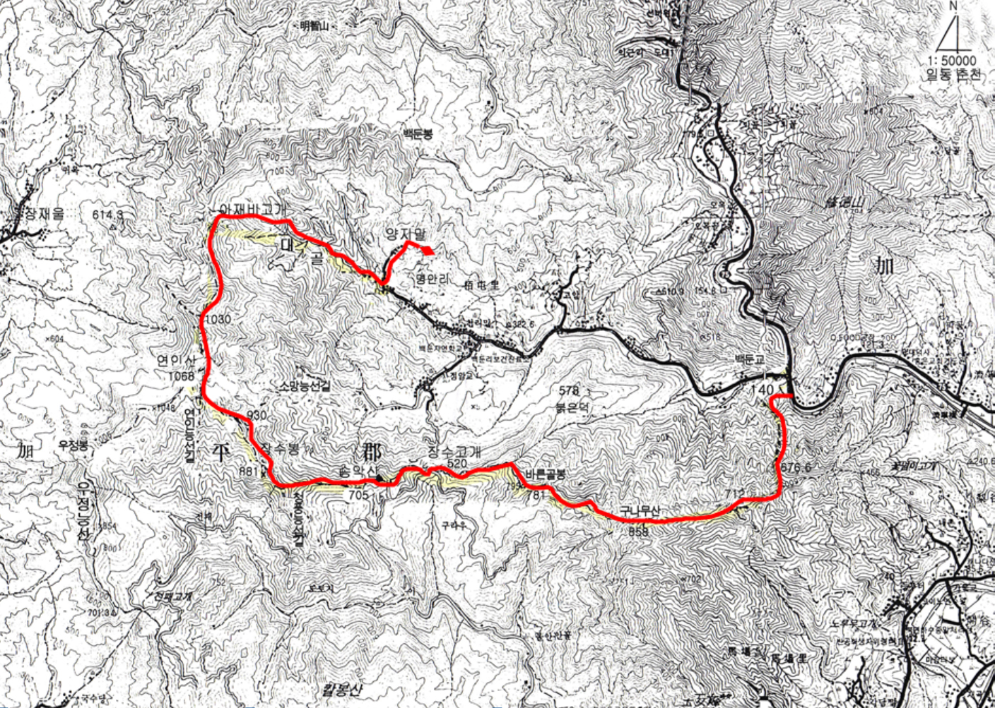 140백둔교-260대원사-뿔바위-676.6작은구나무산-712봉-620안부-858.8구나무산-장수능선-750안부-781바른골봉-795봉-520장수고개.임도-705송악산-830청풍능선길-881장수봉-930봉(소망능선갈림길)-1.068.2연인산-1030봉-문바위-1010봉-863봉-820아재비고개-대골-임도-300양지말 Bus종점