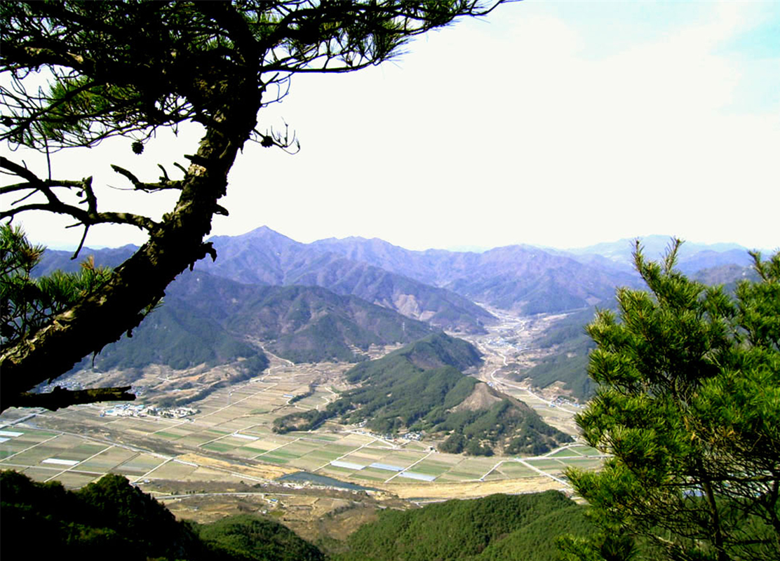 수정봉 정상에서는 잡목으로 조망이 양호하지 않지만 조금 더 진행하여 능선에 서면 동쪽으로 큰 고리봉에서 갈라졌던 바래봉(1,165m), 덕두산(1,149m)의 능선과 백두대간 주 능선에 둘러싸인 마을과 도로가 한눈에 내려다 보인다. 공안리 일대 천수답들이 햇살을 받아 작은 보석들을 깔아놓은 것처럼 반짝인다. 이곳이 1,380년(고려 우왕 6년) 이성계 장군이 왜군 이지발도를 죽이고 크게 이긴 황산대첩의 현장인 황산벌이다. 중간에 우뚝 솟은 산이 황산이다.