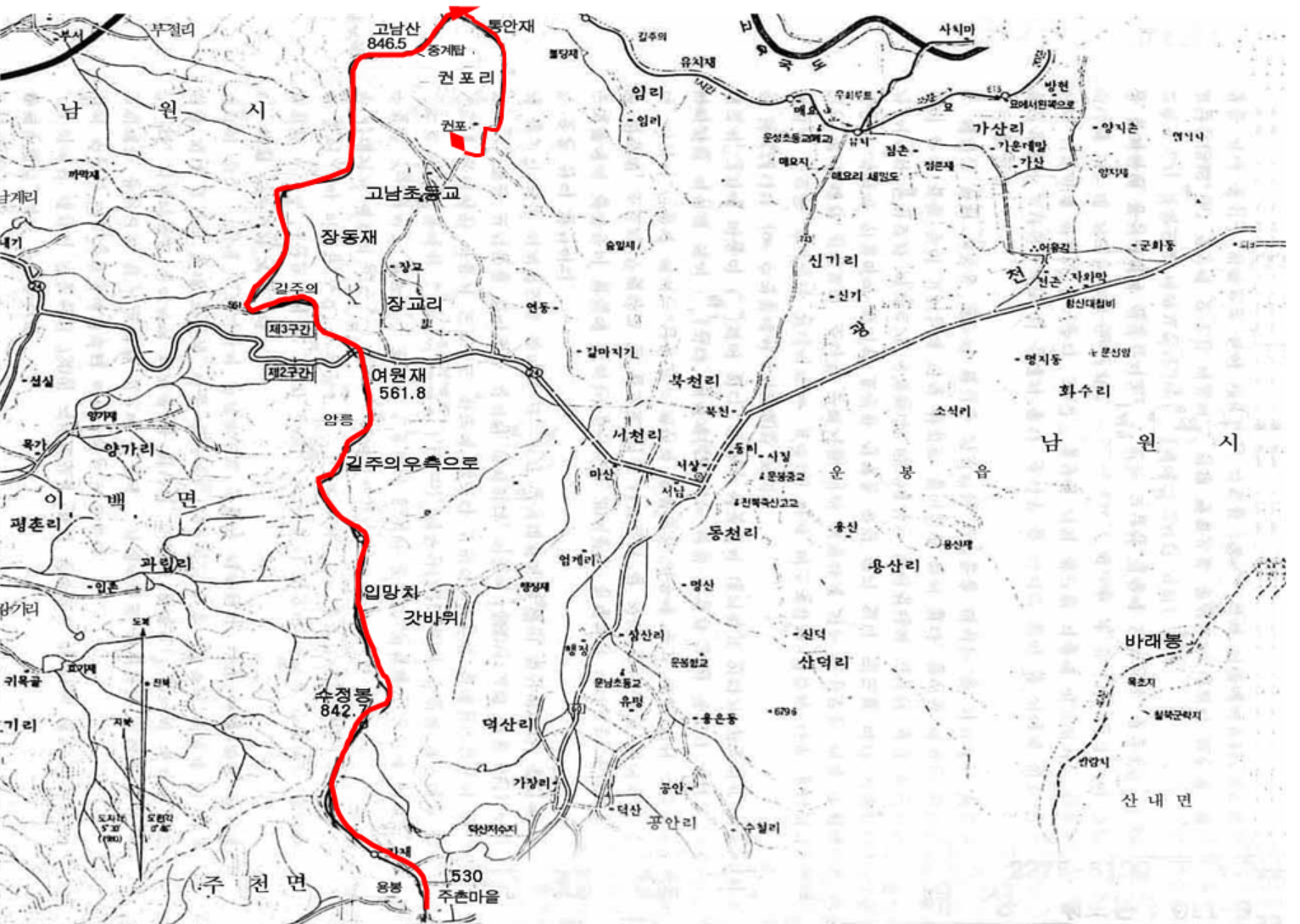 주촌리(530m)-수정봉(804.7m)-입망치-여원재(561.8m)-고남산(846.5m)-통안재-권포리